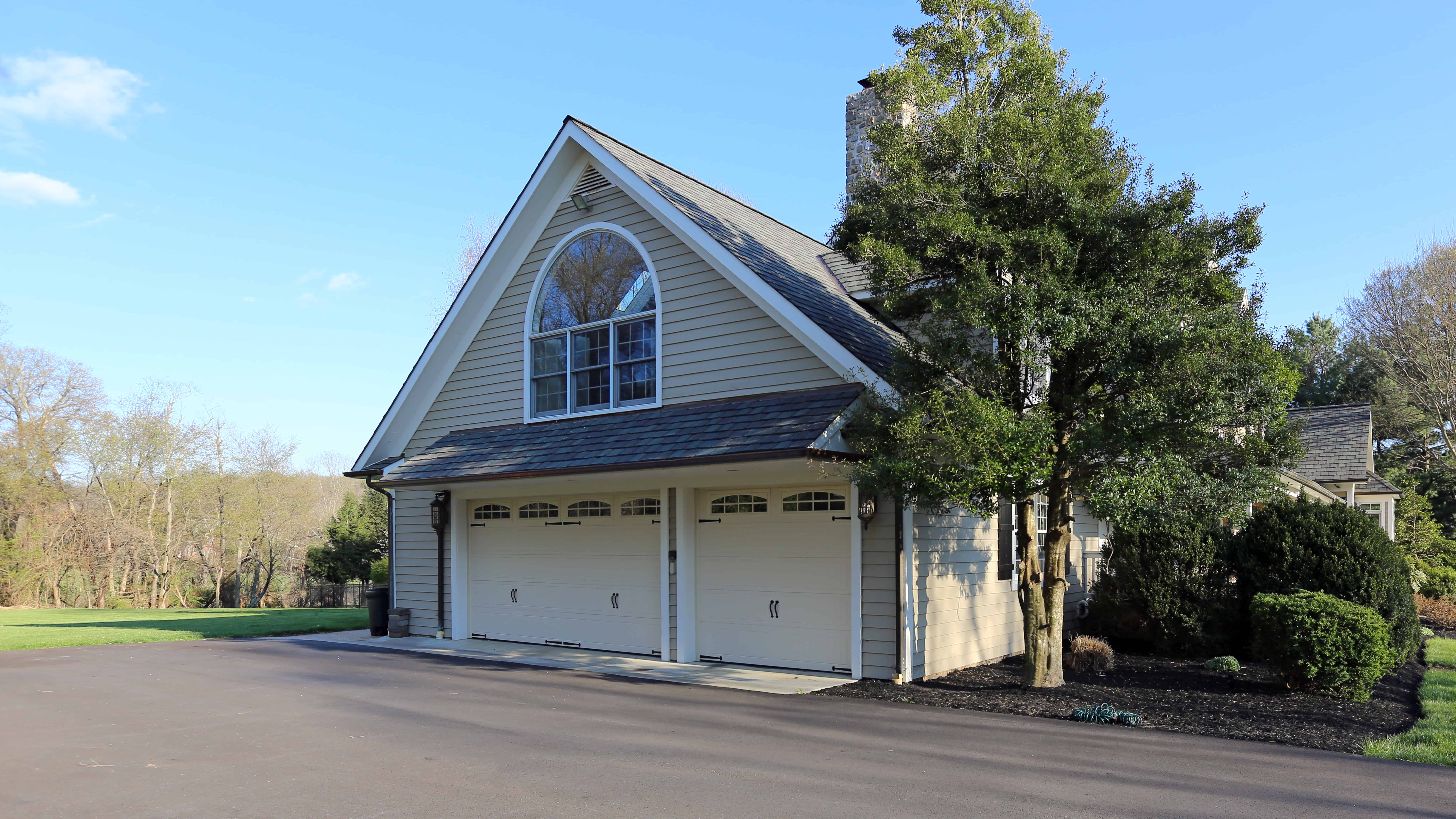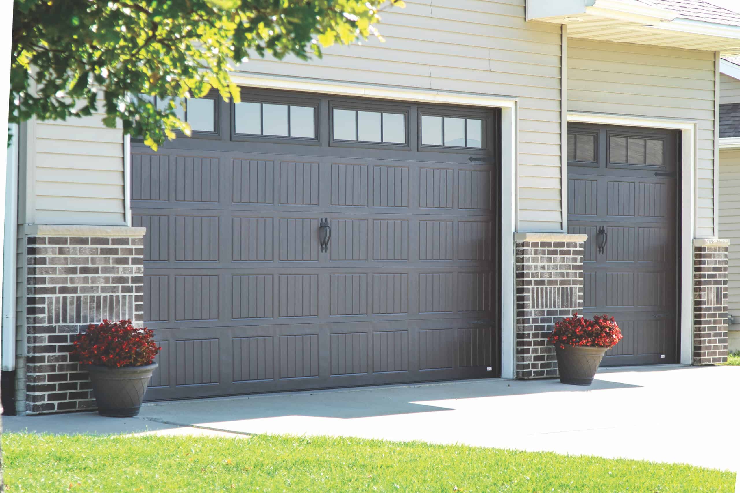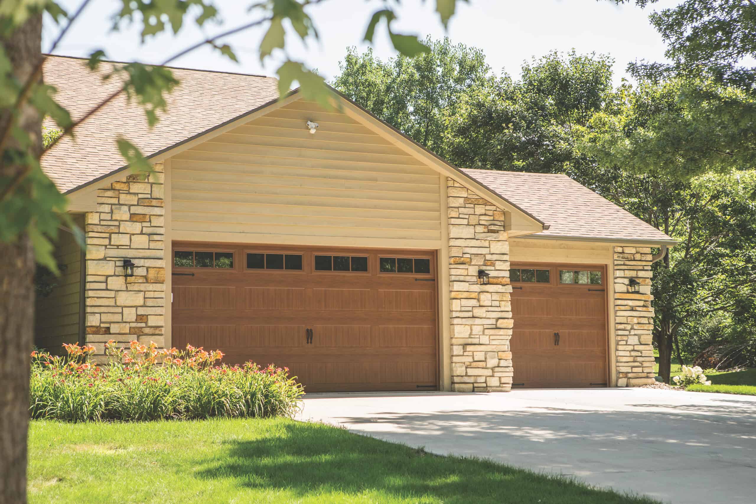 This beautiful custom home features two almond 5760 Thermacore® V5 Series Doors, measuring 16ft x 8ft and 9ft x 8ft. Both garage doors are accented with attractive decorative exterior handles and hinges. The widows consist of 1/2 inch insulated glass with stockton arch overlays. Our Thermacore® Series offers a premium insulated steel door that will help keep your garage comfortable in extreme cold or hot climates. This door provides maximum thermal efficiency and has a R-value of 17.5. Our quiet, yet powerful Destiny 1200 belt driven openers power both doors from this project. A wireless keypad was added to the outside to complete this beautiful remodel.