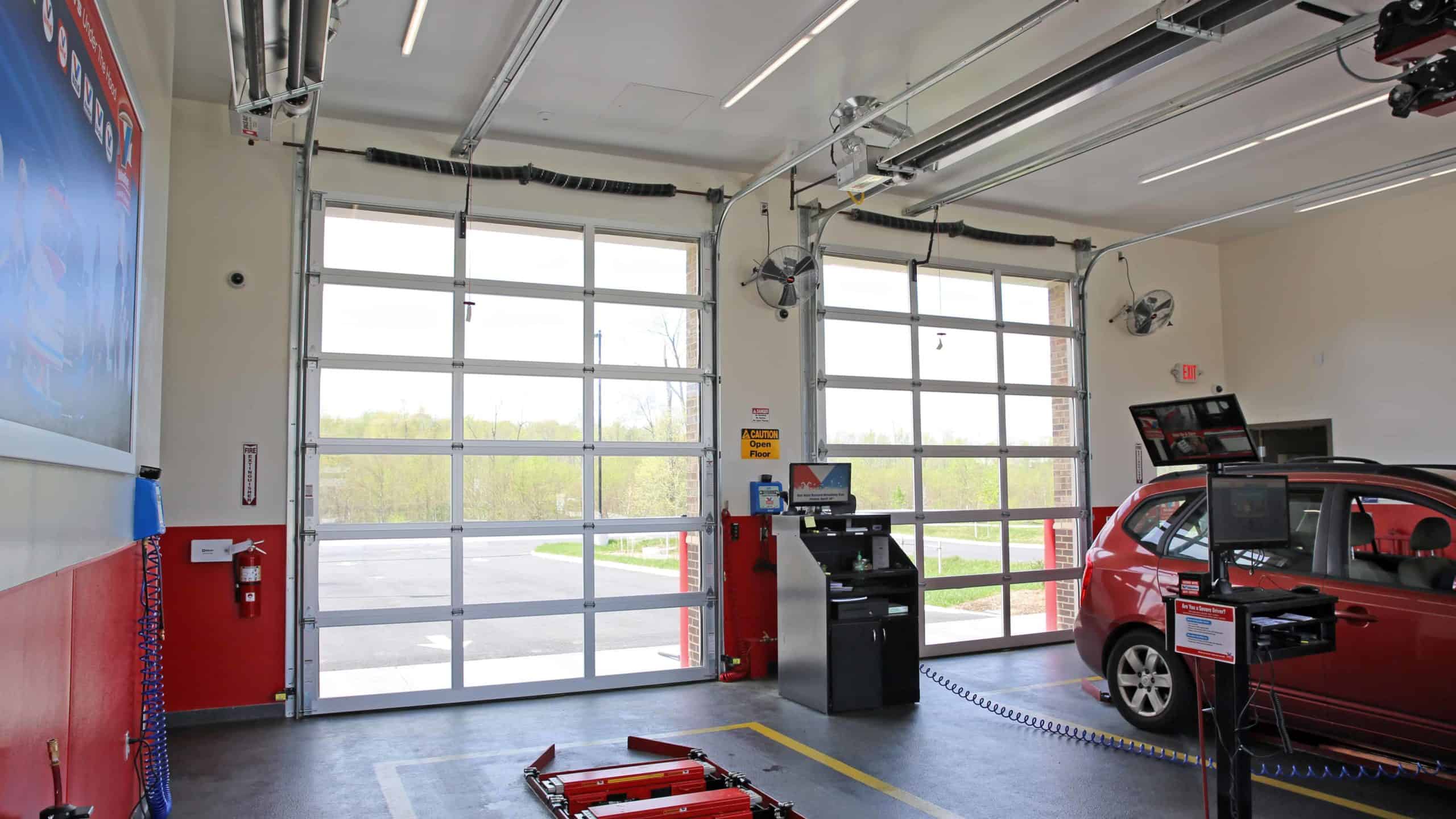 Valvoline Instant Oil Change provides quick, convenient car maintenance services. At the Fredericksburg, VA location, (4) Aluminum Glass 521 Series garage doors were installed. It was important that the garage doors installed on this service center allowed maximum light infiltration and visual access, and the 521 Series does just that! These doors are electrically operated and have an inside slide locks. Since these doors are in constant use, high cycle springs were added. The Aluminum Glass 521 Series are engineered for long life, low maintenance and enduring beauty!