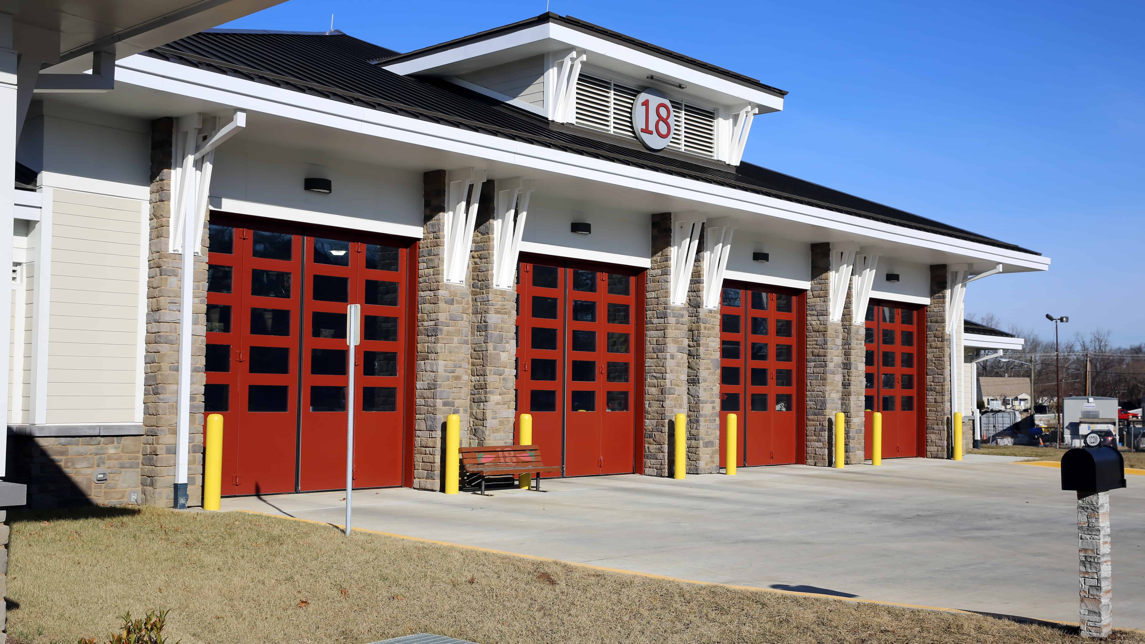 If you’re looking for dependable, fast and sharp looking doors these Four-Fold doors are the way to go! It is important for the team at The Glenmont Fire Station #18 in Silver Spring, MD to get to each call as quickly and efficiently as possible. To help achieve this goal, Door Engineering’s Four-Fold doors were installed by Overhead Door Company of Washington, DC™. Traditional garage doors that roll overhead open in about 14-21 seconds, while these Four-Fold doors open horizontally in just 7 seconds! These doors are electrically operated and full perimeter weather seals were installed to help with climate control. You can customize these doors by choosing different panel layouts, colors, glass types & more. Contact us today to learn more!