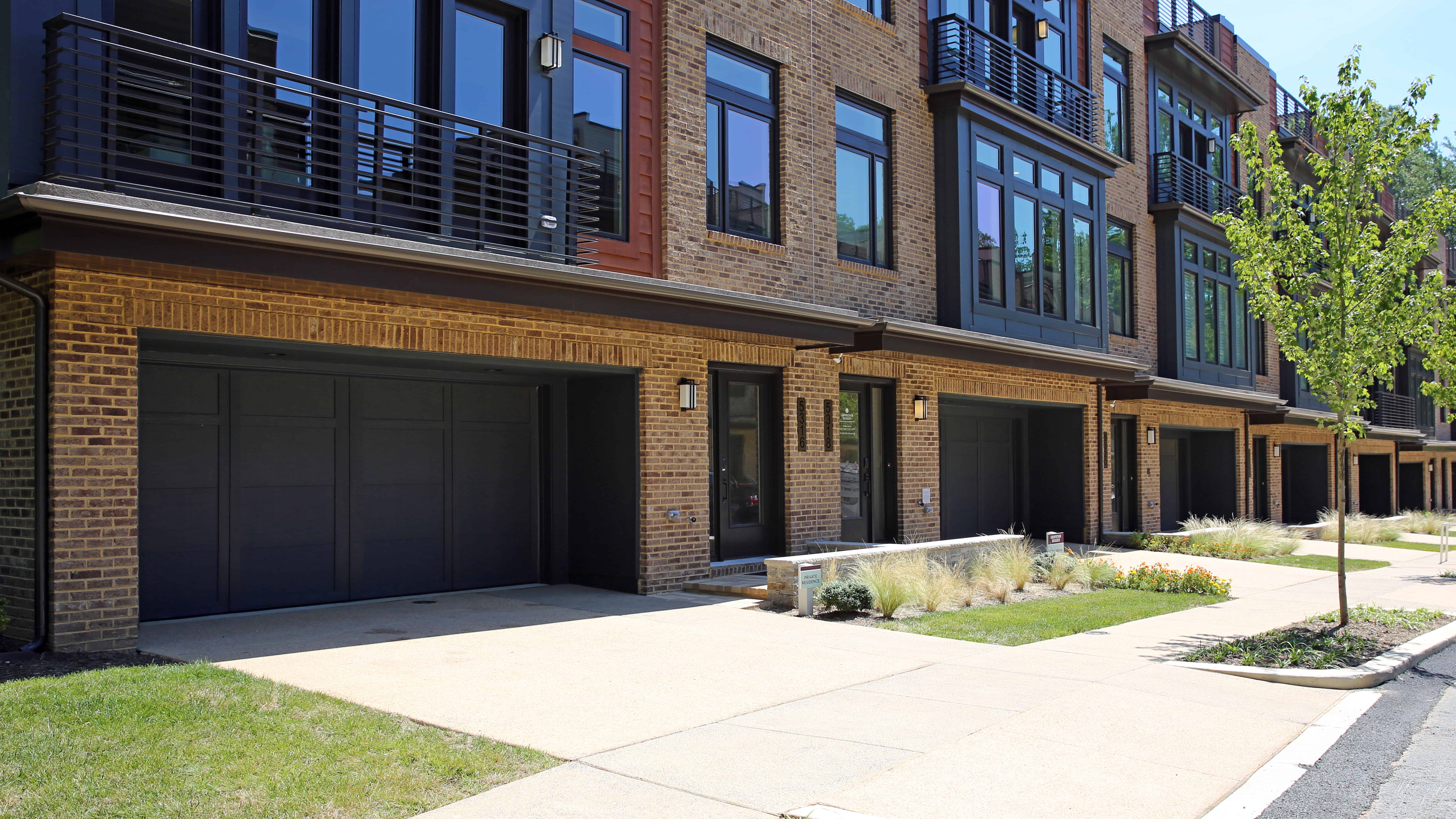 Overhead Door Company of Washington, DC™ is proud to provide the garage doors and openers for the townhomes in EYA’s development – Grosvenor Heights in Bethesda, MD. These luxury townhomes feature 15’0″ x 7’0″ 2-car garage doors from our Courtyard Collection – Model 371T. This classic design enhances the architectural design of the townhouses and has the beauty of wood, but durability of steel. The specially treated trim boards resist weather, fungal decay and insects making it the perfect door for customers looking for low maintenance, yet stylish doors.