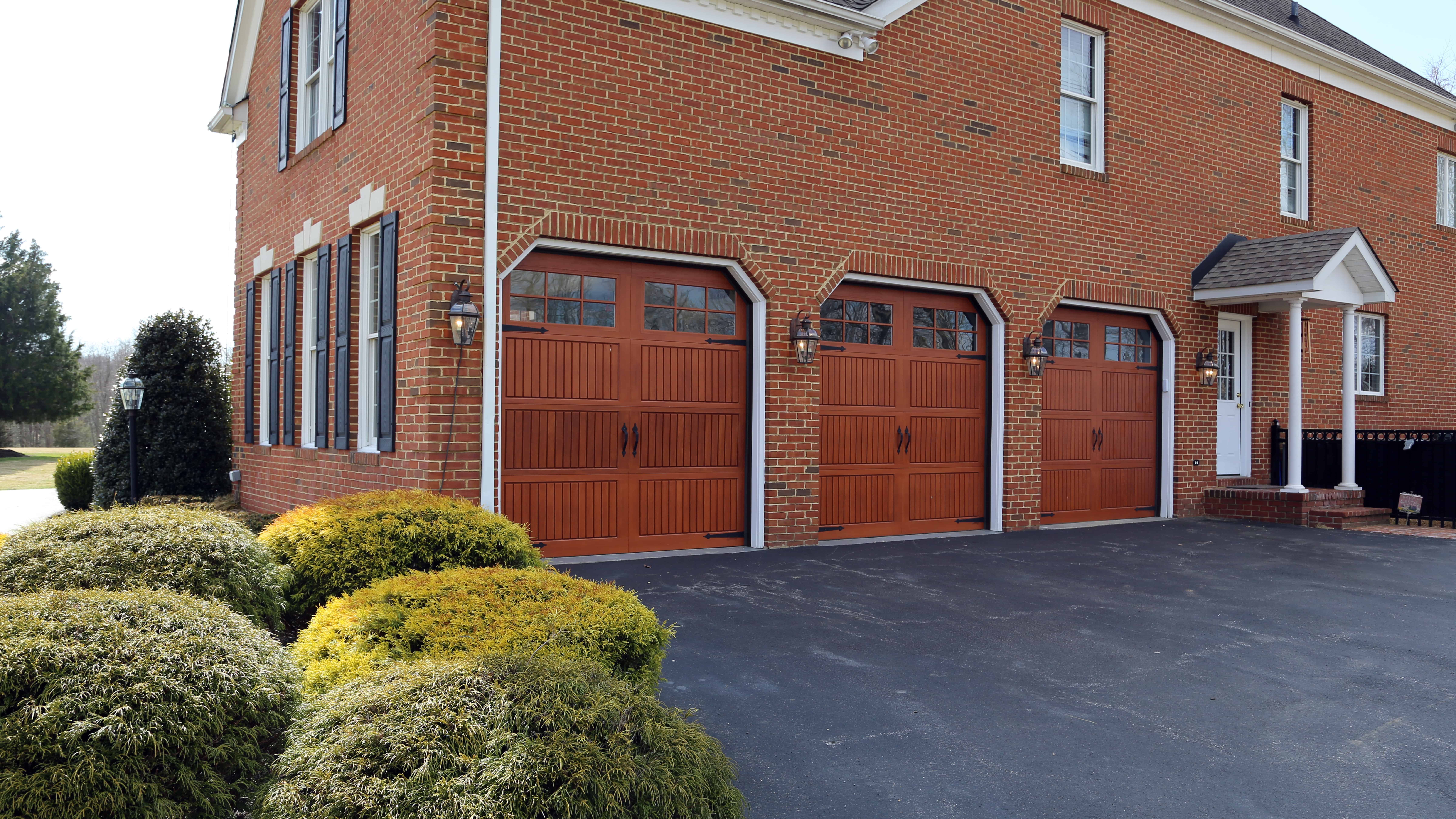 This fabulous home features three sophisticated looking garage doors from the Overhead Door™ Impression Collection. Our Impression Collection garage doors are constructed out of fiberglass which captures the finest wood-grain texture, but requires much less maintenance than natural wood. This homeowner chose our model 983, which features vertical slats, in a cherry stain finish. There are various decorative hardware options. Shown above are large spear handles and spear hinges. In order to operate these garage doors, three Odyssey® 1000′ electric openers were installed which are powerful, quiet and durable. One exterior keypad was also installed which can open any of the three doors from the outside. By choosing these garage doors, this homeowner has added a great deal of warmth and curb appeal to their home.